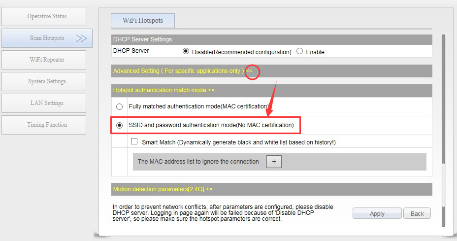 After iPhone is upgrade to IOS13, the MAC address corresponding to the mobile phone hotspot will change every time, the same is true for Huawei’s new mobile phones (maybe other brands also have this issue), but VONETS bridge is by default to match the MAC address to connect, when the mobile phone is connected to iPhone hotspot, you need to select "SSID and password authentication mode (no MAC authentication)", please refer to the following picture to set: