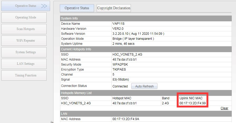 First open a hotspot for the device to use the phone. After the connection is successful, you can enter the status page of the device, and you can see the MAC address of the uplink network card, as shown in the figure:
