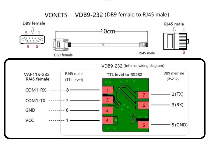 RJ45 connector + DB9 interface (with integrated RS232 chip)